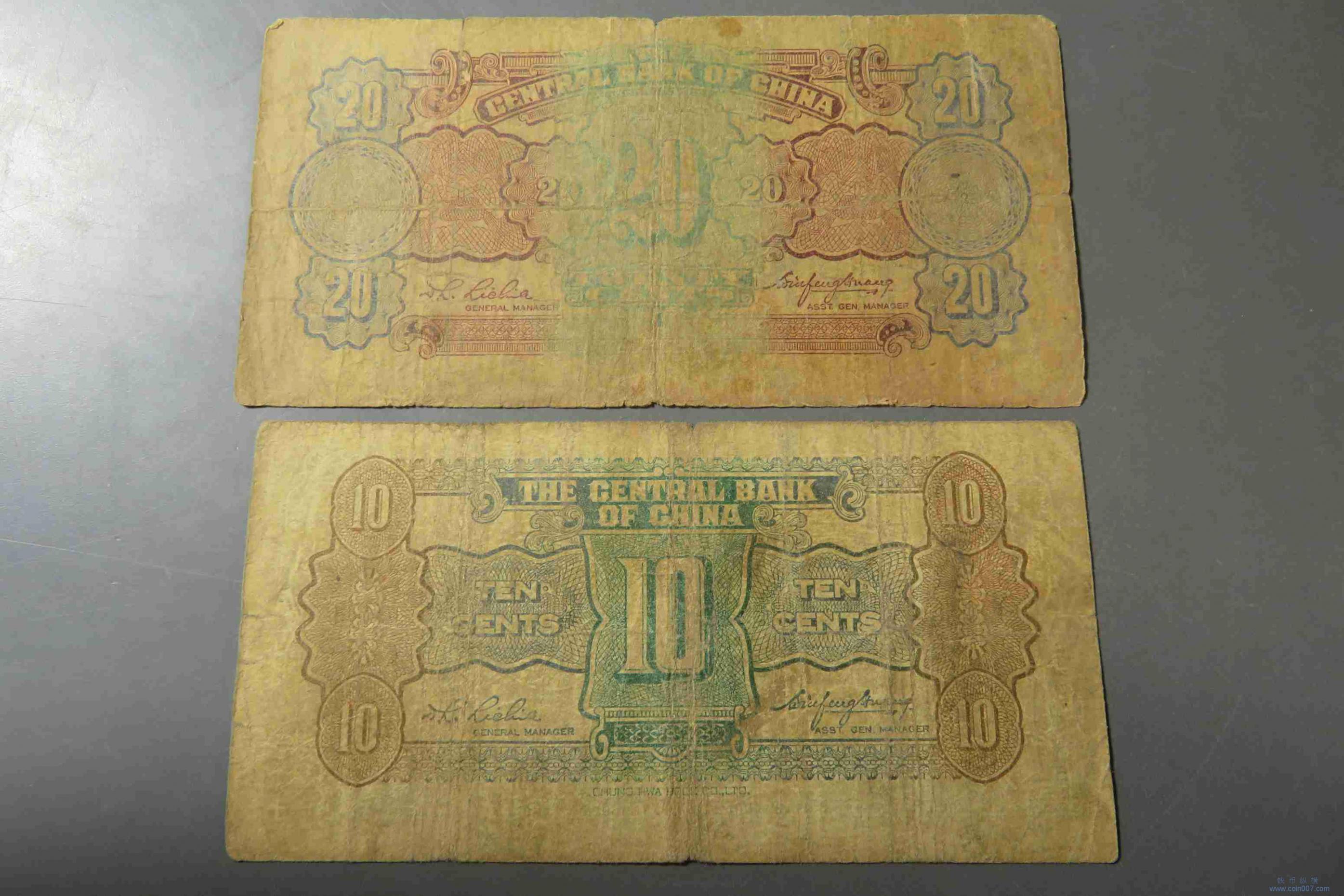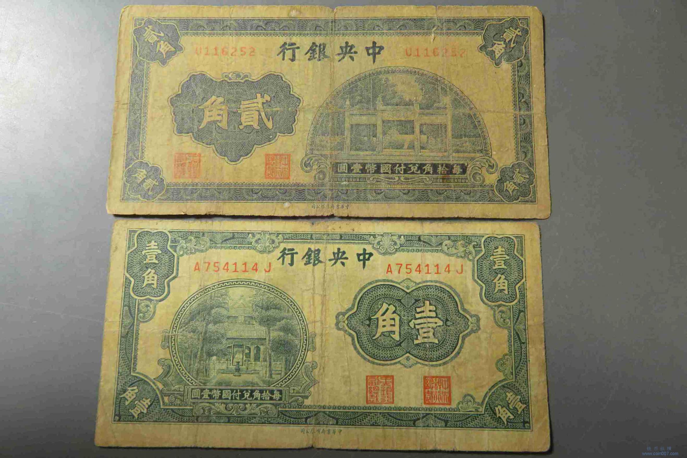 T0291.中央银行壹角贰角纸币2张