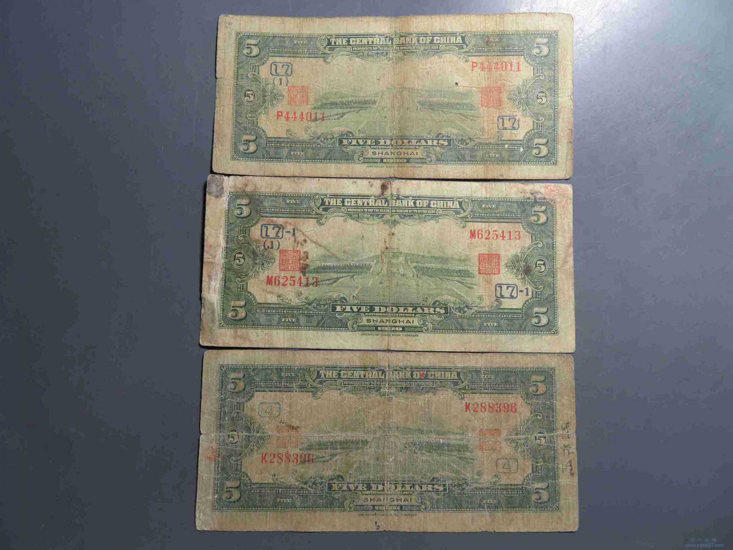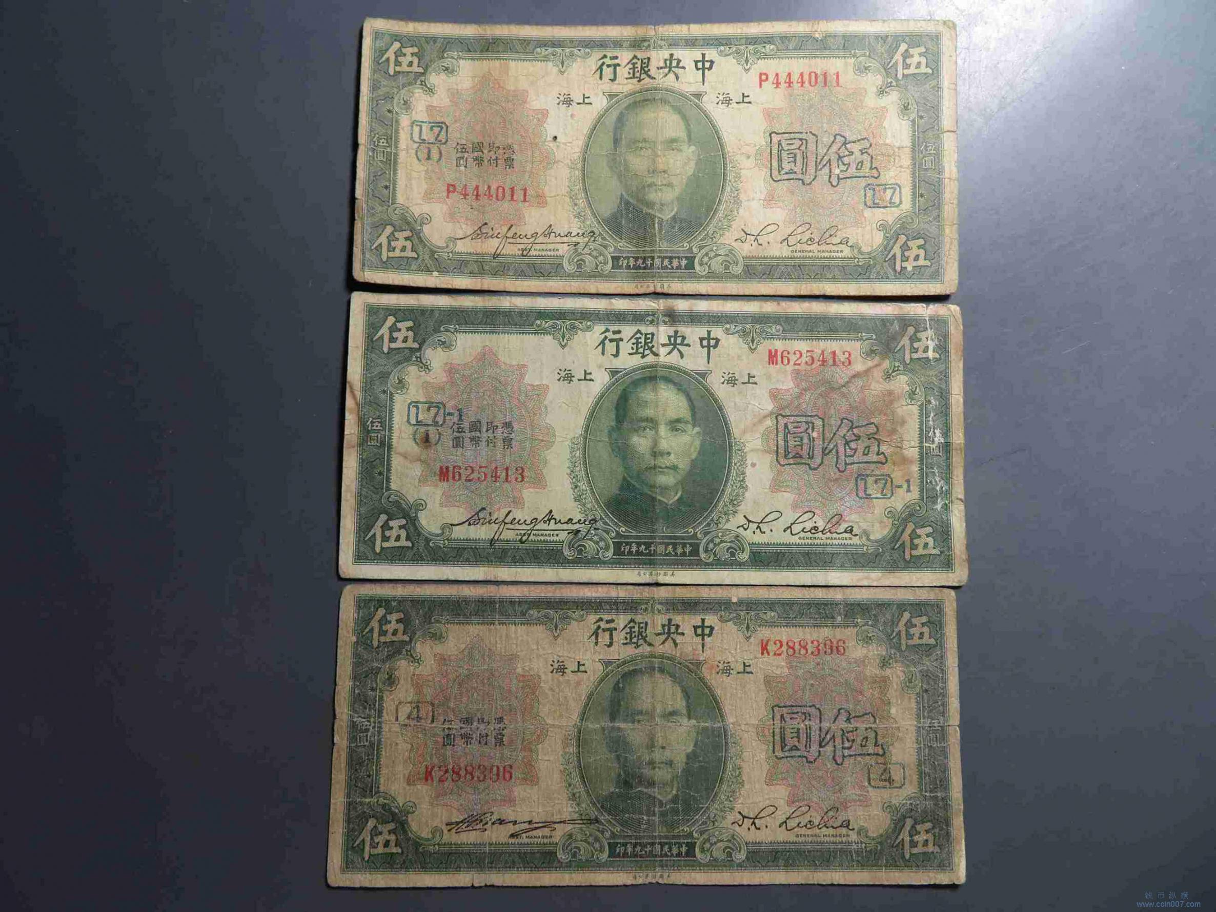 | R1038.民国19年中央银行伍元 上海地名加字 共3张 |
