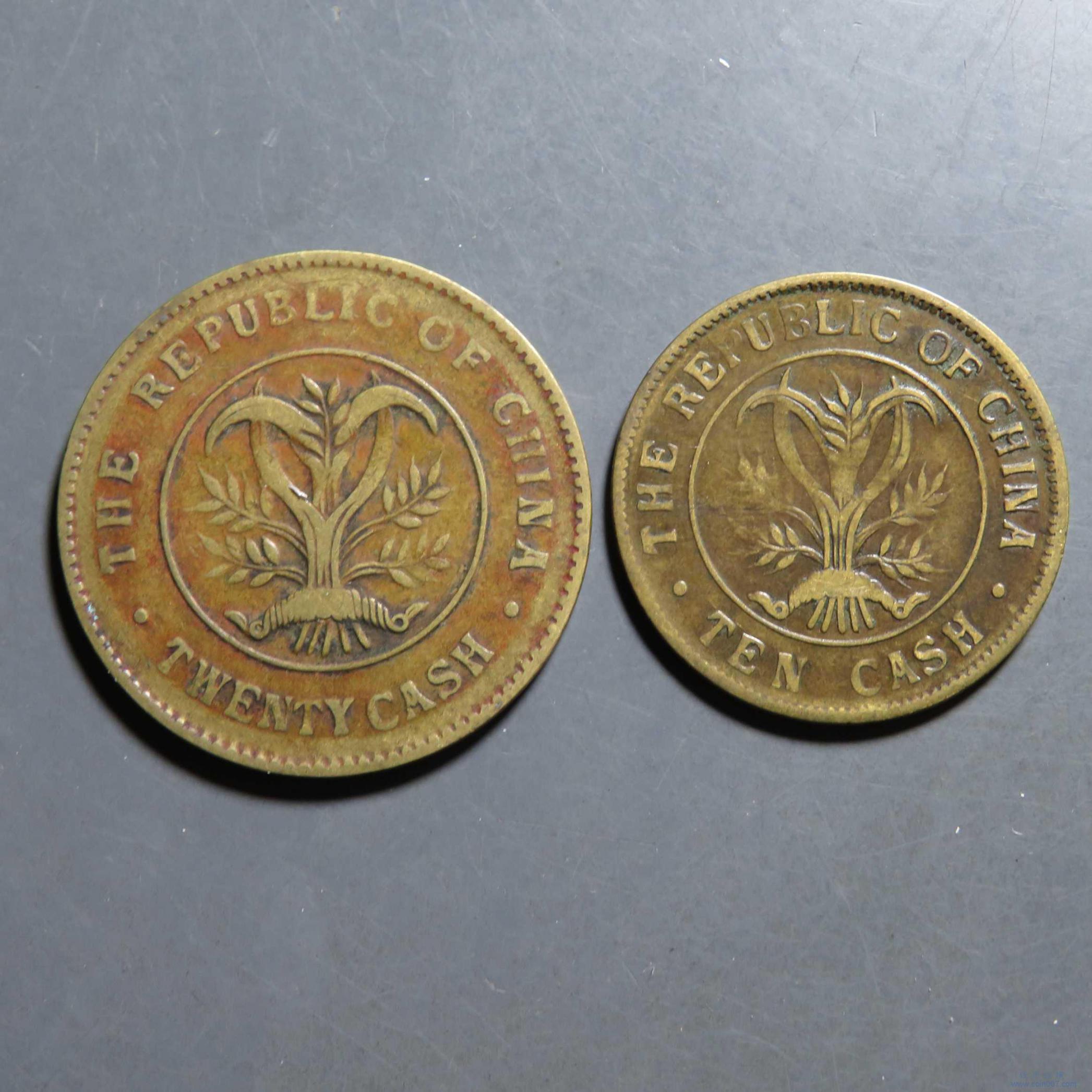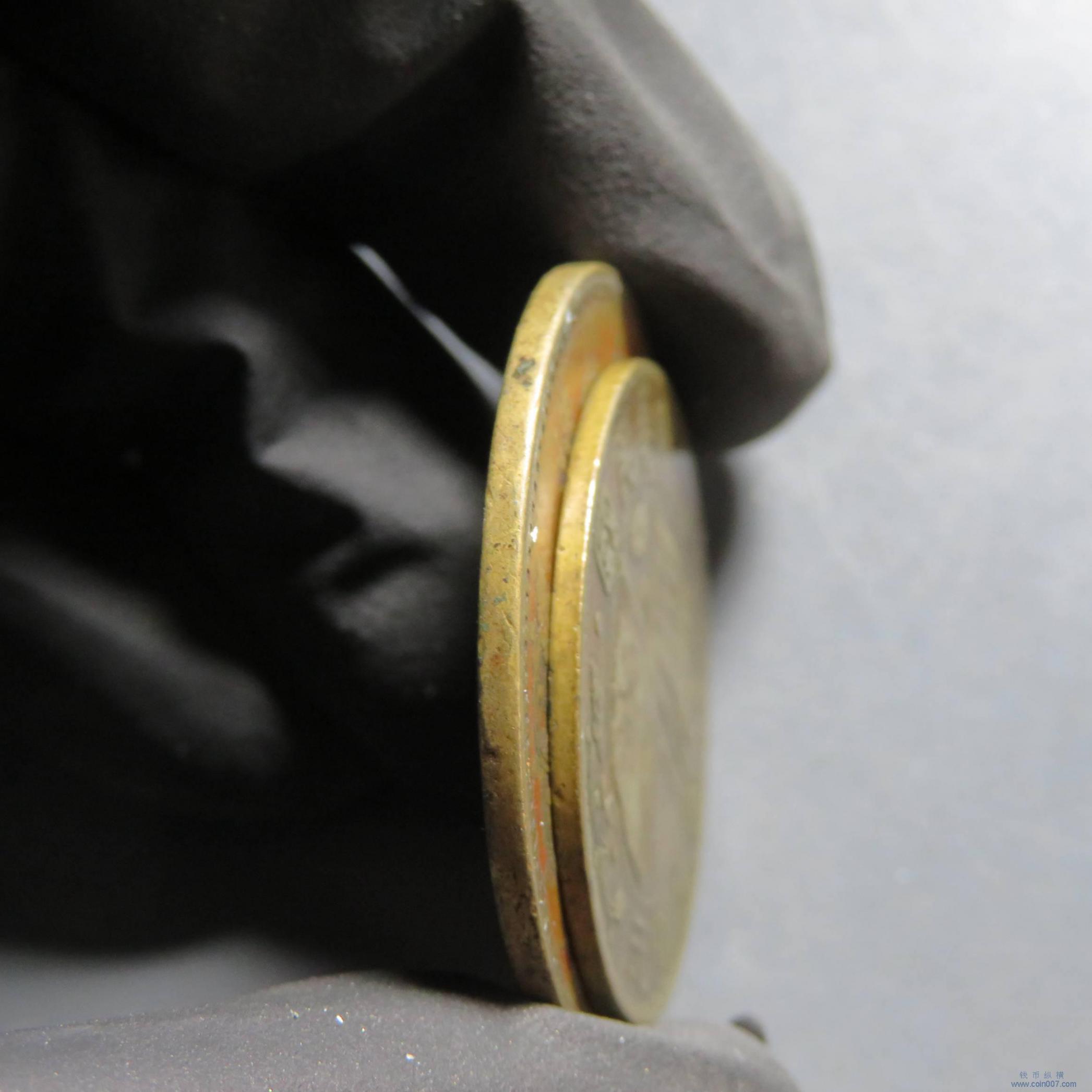 | W1080.湖南双旗黄铜币2枚双柱 当二十铜元等 好品 |