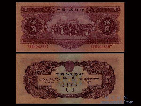 1953年中國人民銀行第二版人民幣伍圓(V IV III 4068367),“各民族大团结(红色)”Pick 869a,S/M C283-13,未使用