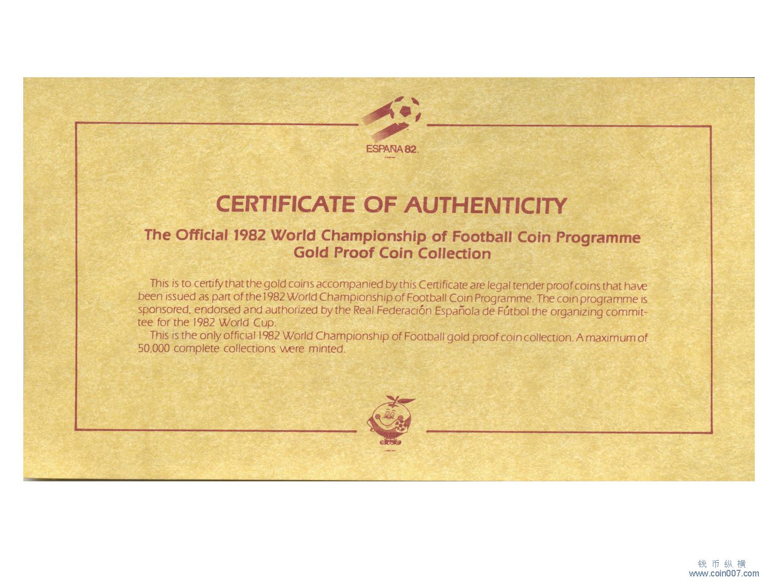 726 1982年世界盃足球賽金幣一套6枚,鏡面精製,是唯一一套官方發行的世界盃足球賽金幣,發行量50,000套,帶盒帶證書。W&B Capital藏品