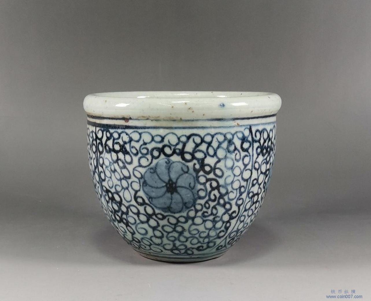 | 春1365.瓷质-青花宝相花缠枝纹小缸。日本回流。 |