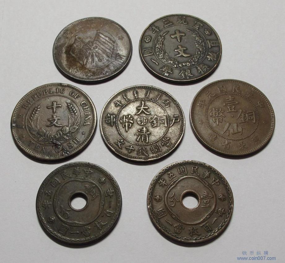 L784.大清,民国广东,湖北,中央十文铜币,共7枚