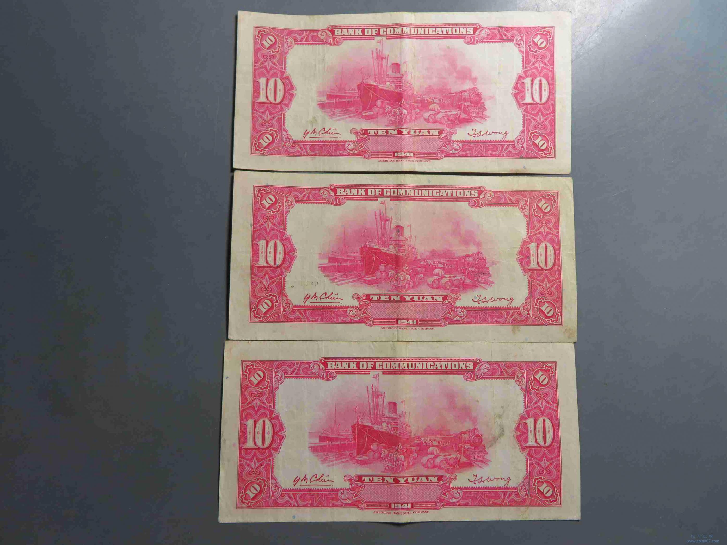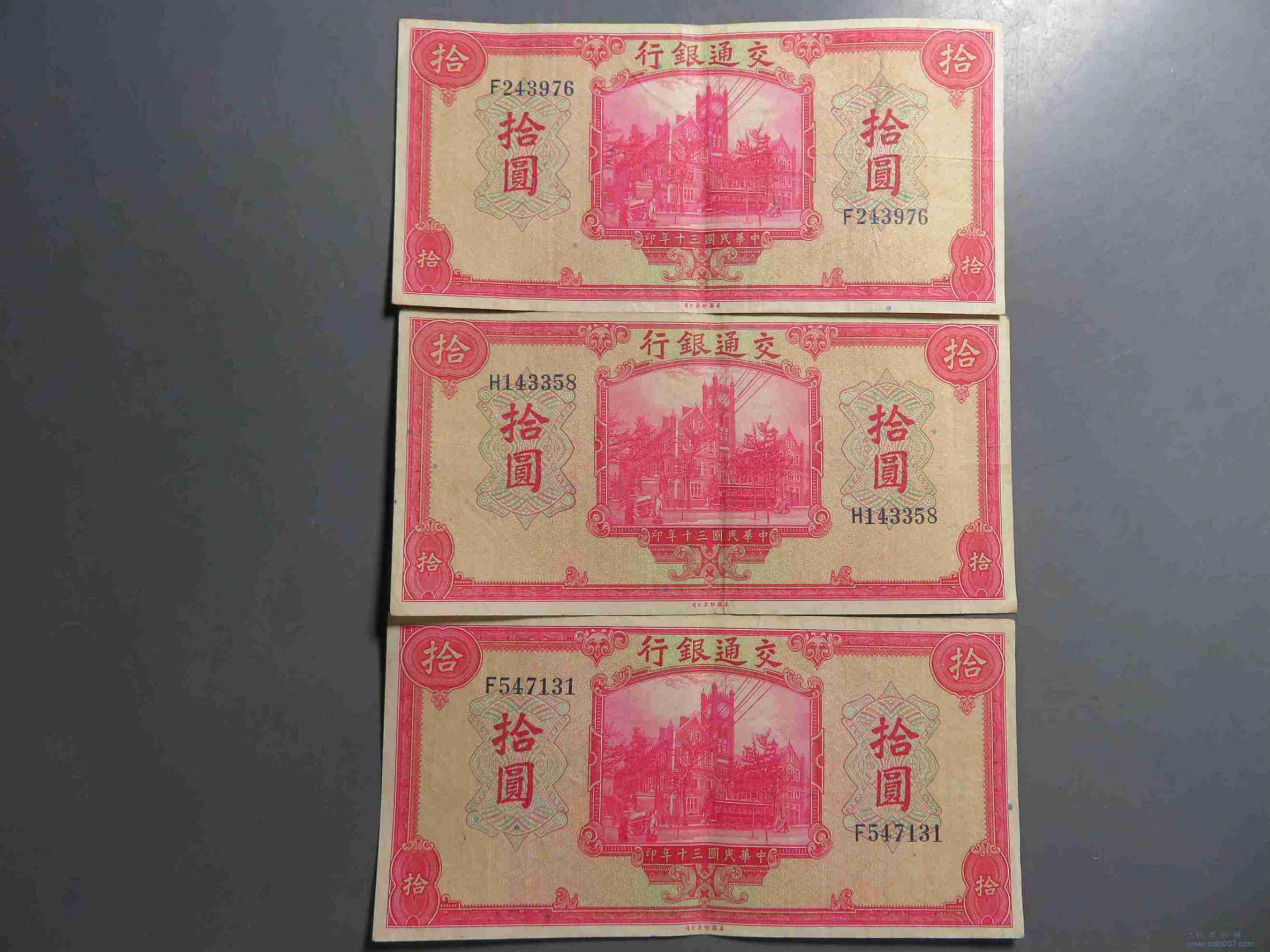 | R1030.民国30年交通银行拾元纸币 3张 美钞版 |