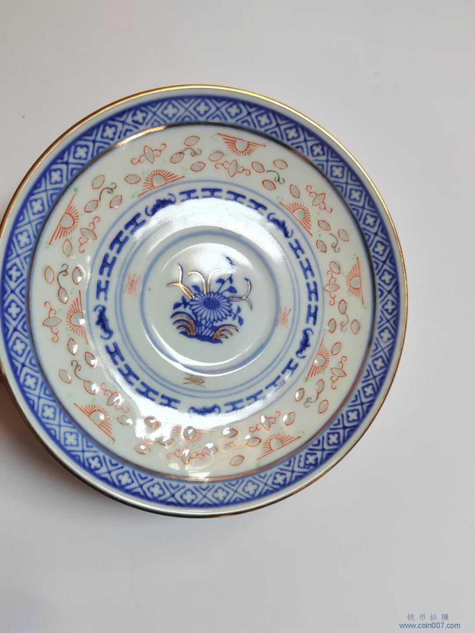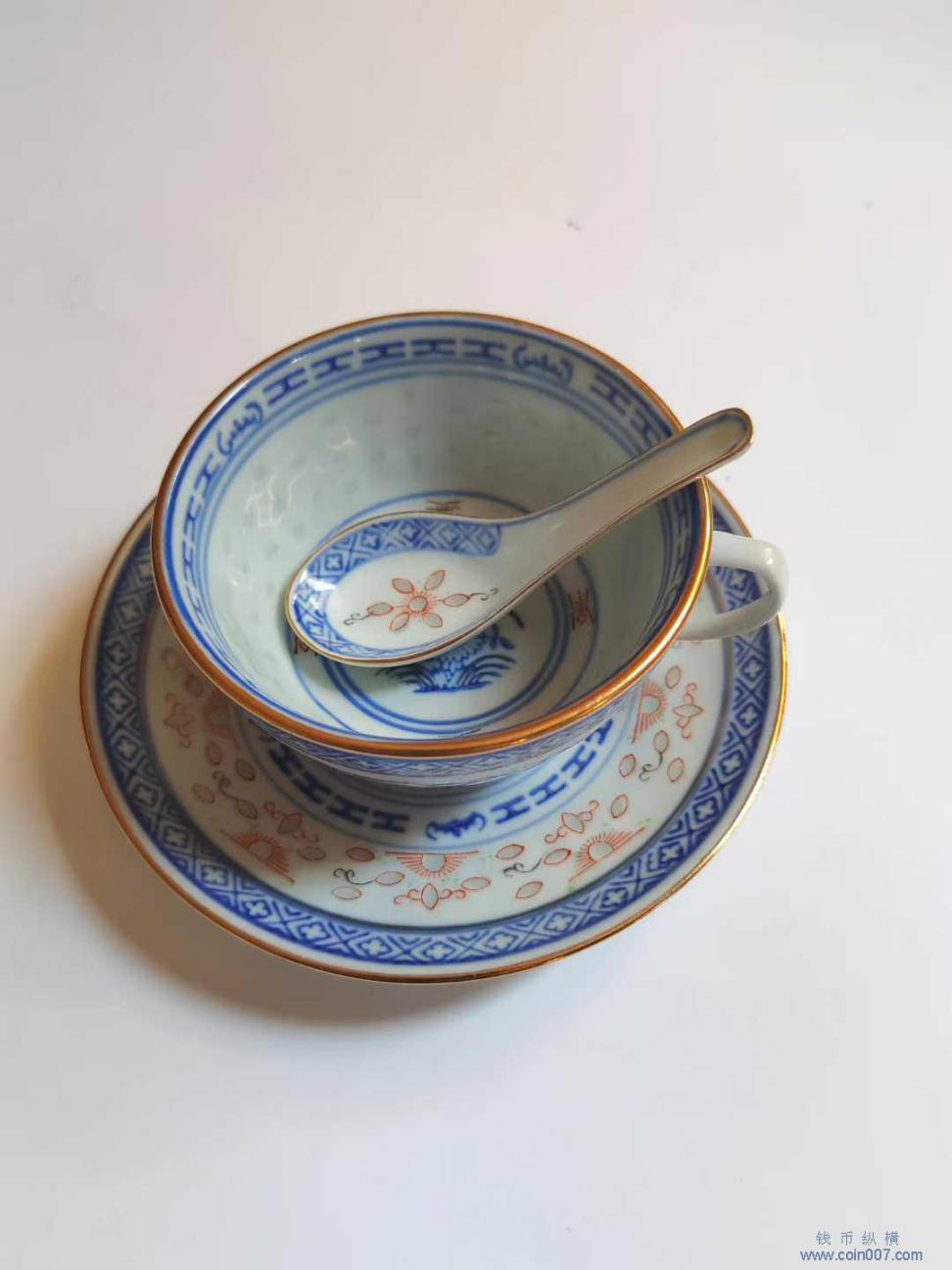 567瓷 青花描金玲珑杯碟勺一套